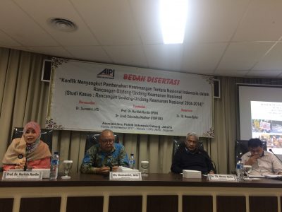 Tampil sebagai narasumber Dr. Sumantri, M.Si dengan pembahas Prof. Dr. Nurliah Nurdin dan Dr. Sidra Tahta Mukhtar. Adapun topik disertasi yang dibahas adalah Kewenangan TNI dalam Rancangan Undang Undang Keamanan Nasional 2004-2014.