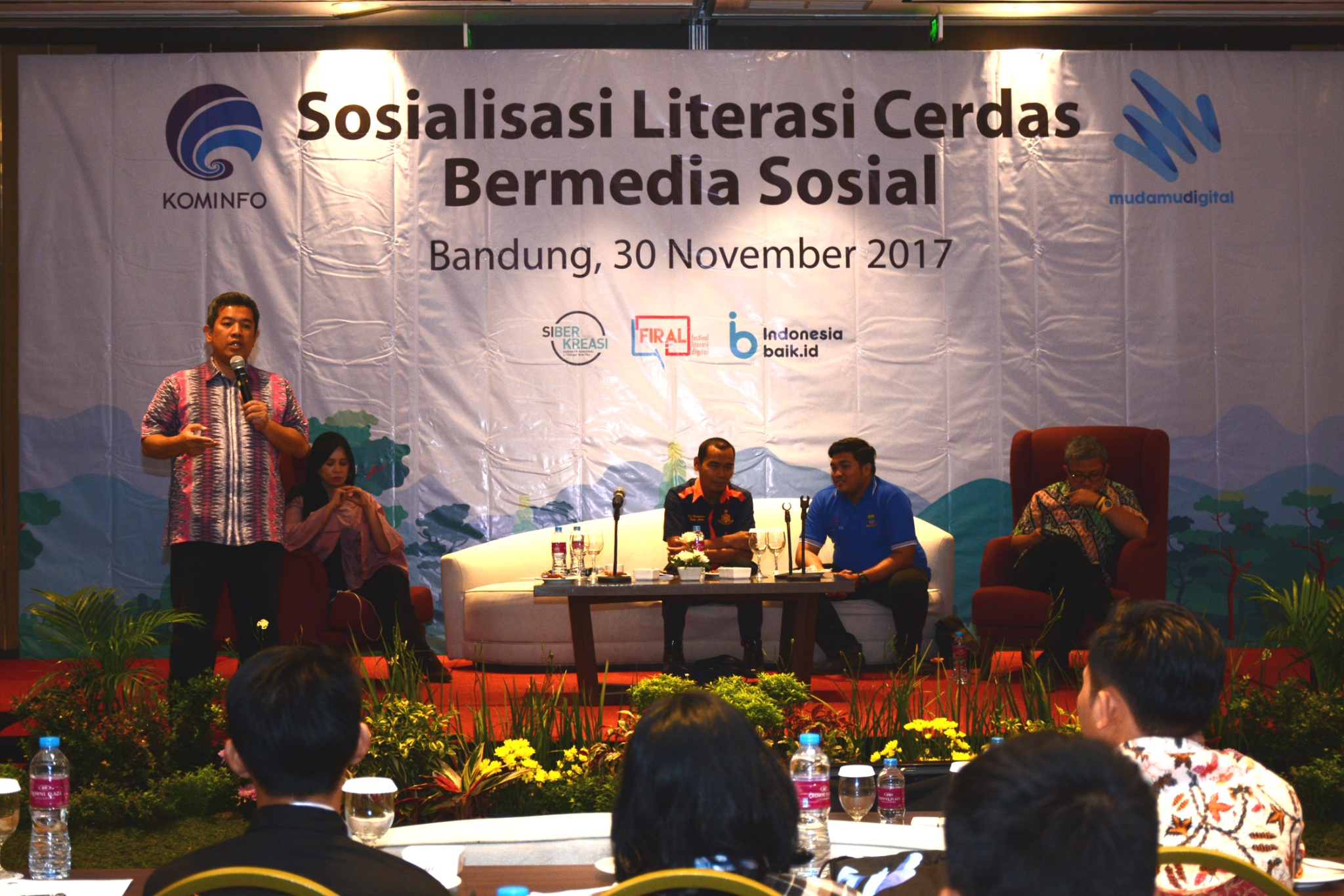 Kemenkominfo menggaet ratusan mahasiswa untuk terlibat dalam sosialisasi yang bertajuk ‘Literasi Cerdas Bermedia Sosial’, di Crowne Plaza Bandung, Kamis (30/11).