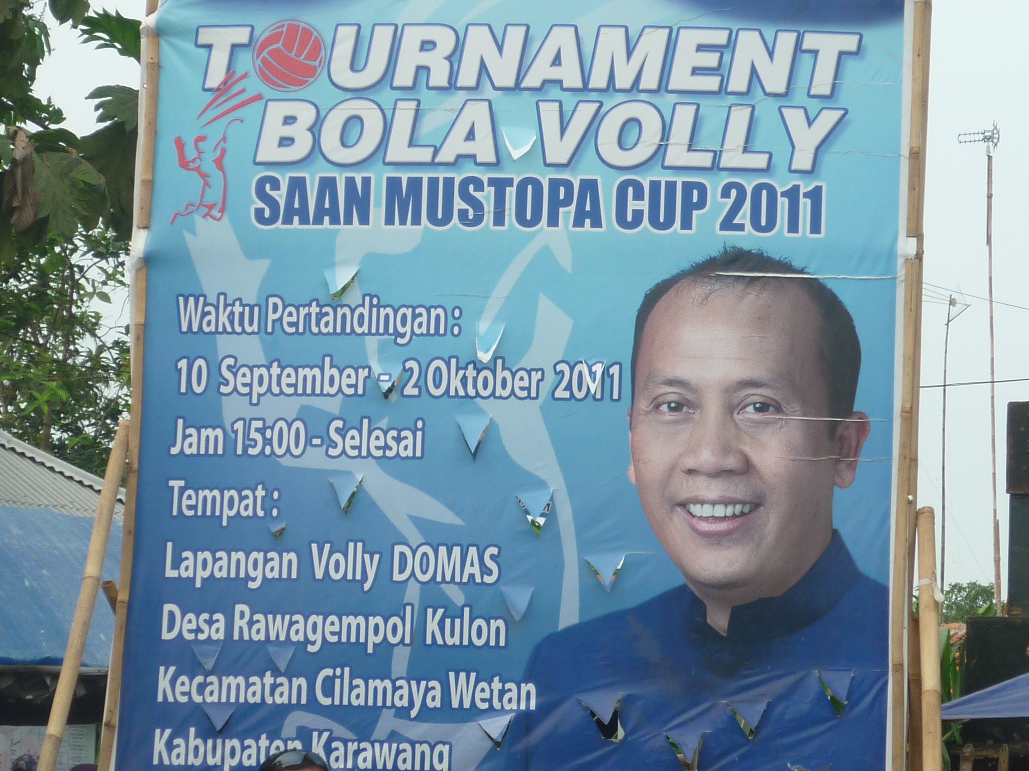 Minggu (2/10) sore sedang grand final Saan Mustopa Cup 2011 di lapangan volly Domas, Rawagempol Kulon, Cilamaya, Wetan Karawang. Acara yang memperebutkan piala bergilir Anggota DPR RI Fraksi Partai Demokrat, Saan Mustopa, itu dihadiri oleh Ketua Umum DPP Partai Demokrat Anas Urbaningrum.