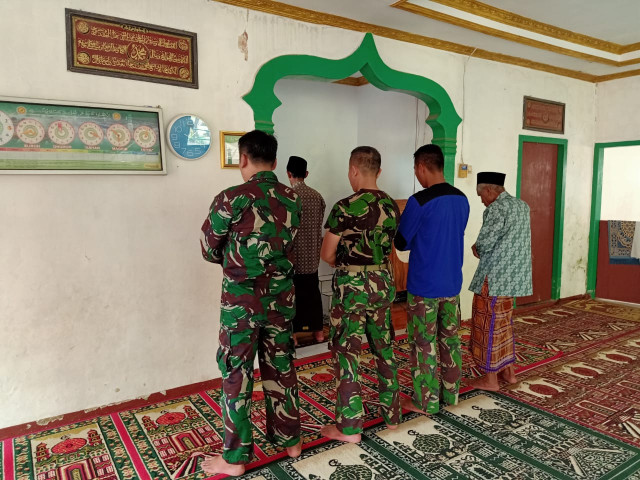Nampak personel Satgas TMMD ke-108 Kodim 0605/Subang tengah melaksanakan Shalat Zuhur berjamaah dengan warga di salah satu masjid di Desa Cintamekar, Kecamatan Serangpanjang, Kabupaten Subang, Minggu (19/7/2020).