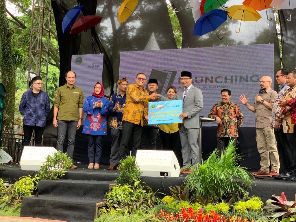 Pejabat Dirut bank bjb merangkap Direktur Kepatuhan dan Manajemen Risiko bank bjb, Agus Mulyana (kiri), secara simbolis, menyerahkan bantuan Program Kolecer dan Candil kepada Gubernur Jabar, Ridwan Kamil, Sabtu (15/12), di Taman Sempur Kota Bogor.