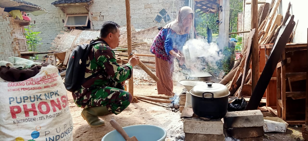 Sebelum berangkat ke lokasi pembangunan TMMD, Pelda Rimun membantu ibu cicih memasak untuk sarapan pagi rekan rekanya sesama anggota Satgas lainya.