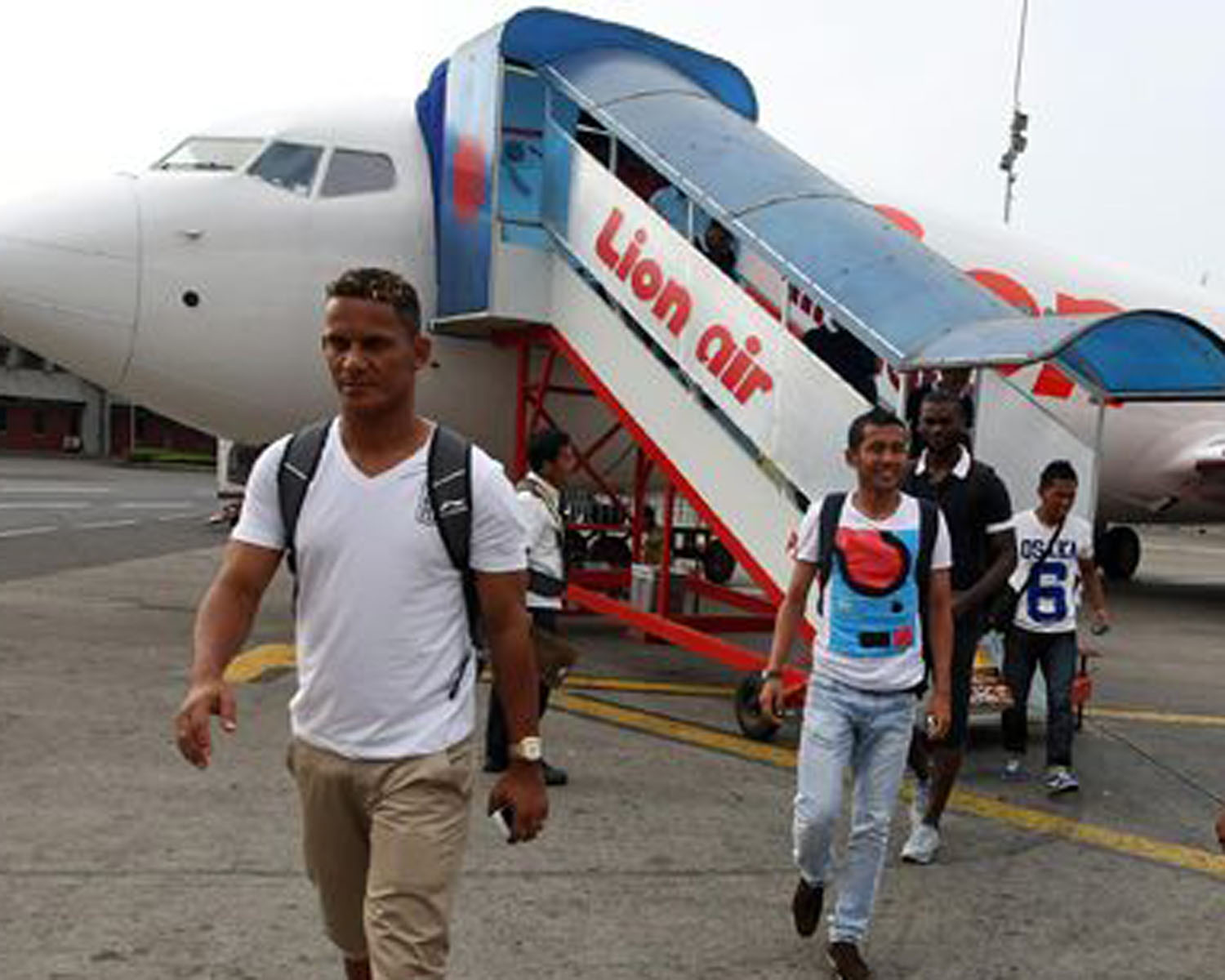 Nampak turun dari pesawat Lion Air pemain Persib Marcio Souza (kiri), M. Nasuha, M. Ilham (tak terlihat) yang terbang bersama pesawat JT 0391 dari Pekanbaru, Riau Kamis (24/5).