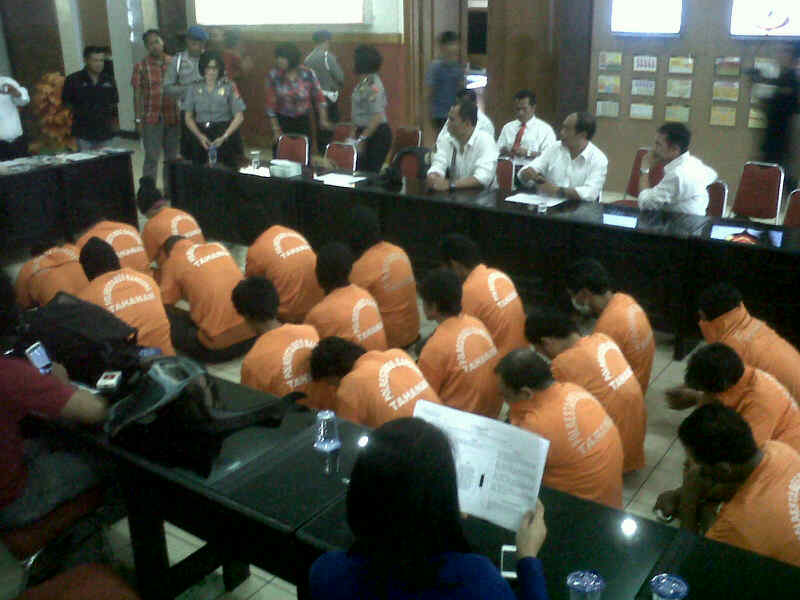 Belasan tersangka judi togel yang diamankan Polrestabes Bandung diperlihatkan dalam ekpose di Mapolrestabes Bandung, Senin (10/2/2014). Mereka ditangkap di beberapa tempat berbeda. (JABARTODAY/AVILA DWIPUTRA)