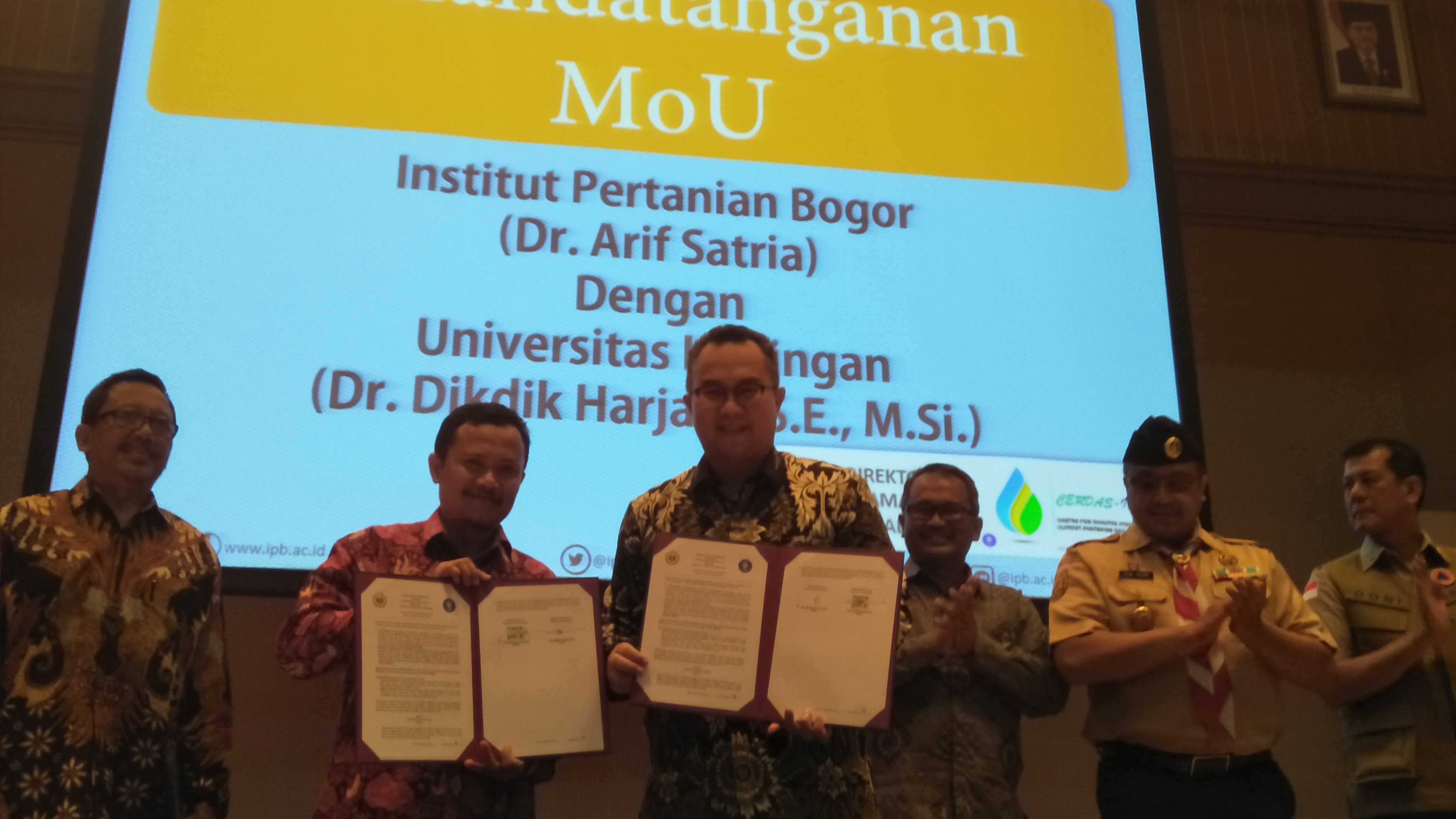 Penandatangan MoU antara Uniku-IPB disaksikan juga oleh Ketua Badan Nasional Penanggulangan Bencana (PNPB) Letjen Doni Monardo, Ketua Kwartir Pramuka Jabar, Dede Yusuf dan Rektor Unma, Prof. Dr. Sutarman. (ruz)